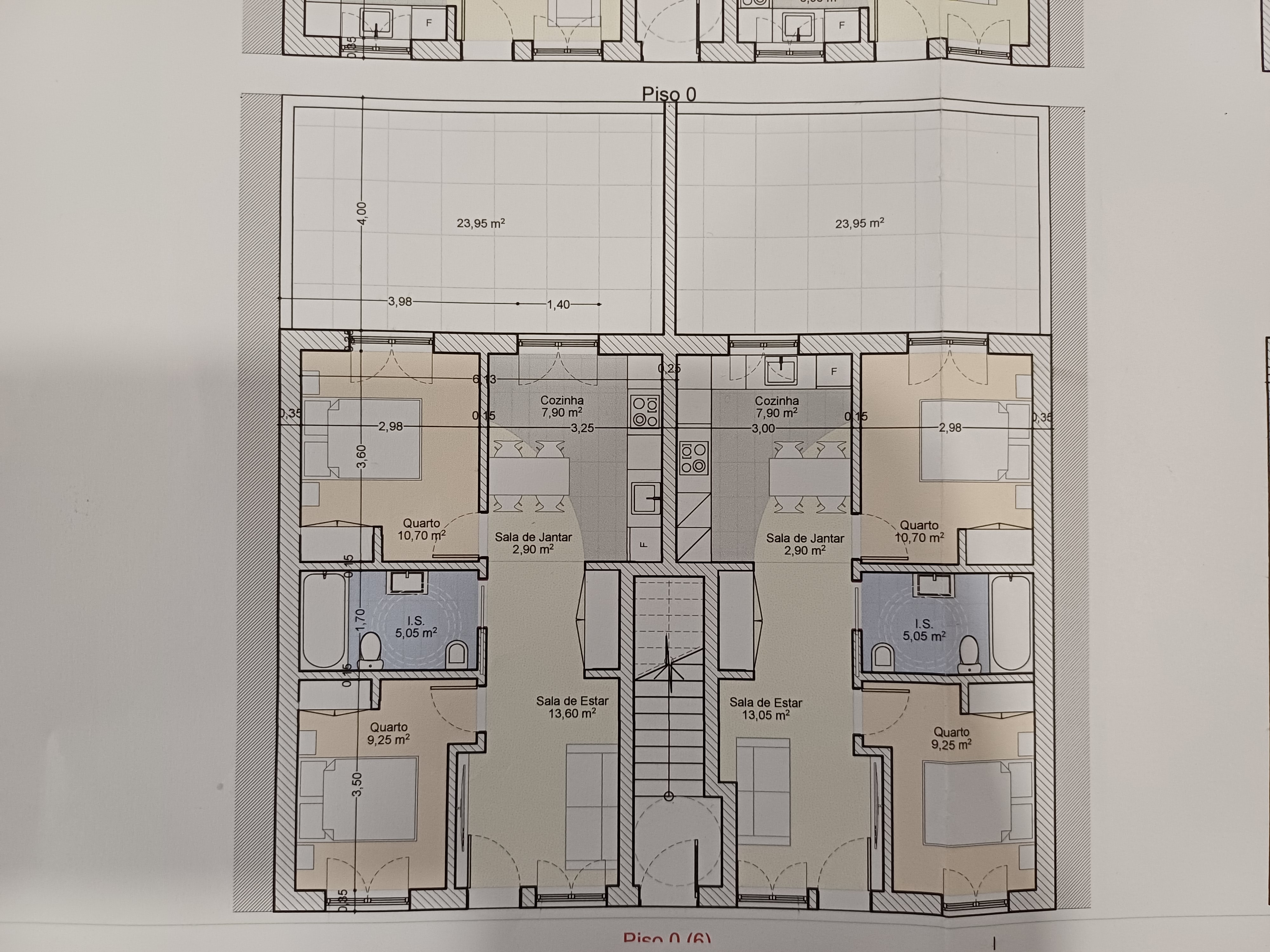 Current Distribution: Floor 0 with 2 T2 apartments, each with a 23.95m² rear terrace; Floor 1 with 2 T1 apartments, both with a 7m² balcony; Floor 2 with 2 T2 duplex apartments, each with a 7m² balcony.